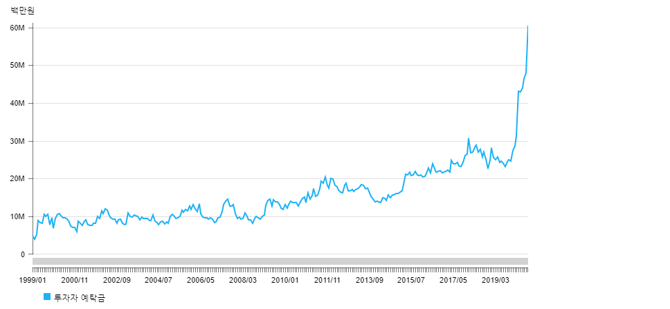 현재 증권예탁금 규모가 60조원을 넘어서고 있다는 뉴스를 볼 수 있는데 올해 초 대비해서 약 3배가 안되는 정도로 올라간 수치이다. 전부 빚으로 예탁금이 늘었다는 것은 조금 억측이 있는 것 같고 아마도 시중의 유동자금 일부가 증시로 유입된 영향이 크다고 본다. 증가폭이 상당히 크긴하지만 한동안 외면받았던 증시에 비하면 우려할 만한 수치는 아닌점 최근 빅히트 엔터테인먼트 등 공모주를 청약받기 위해 일시적으로 자금이 유입된 점 등을 감안하면 현재 저금리 상황에서는 뭔가 큰일이 일어날 징조로 볼 수는 없다.